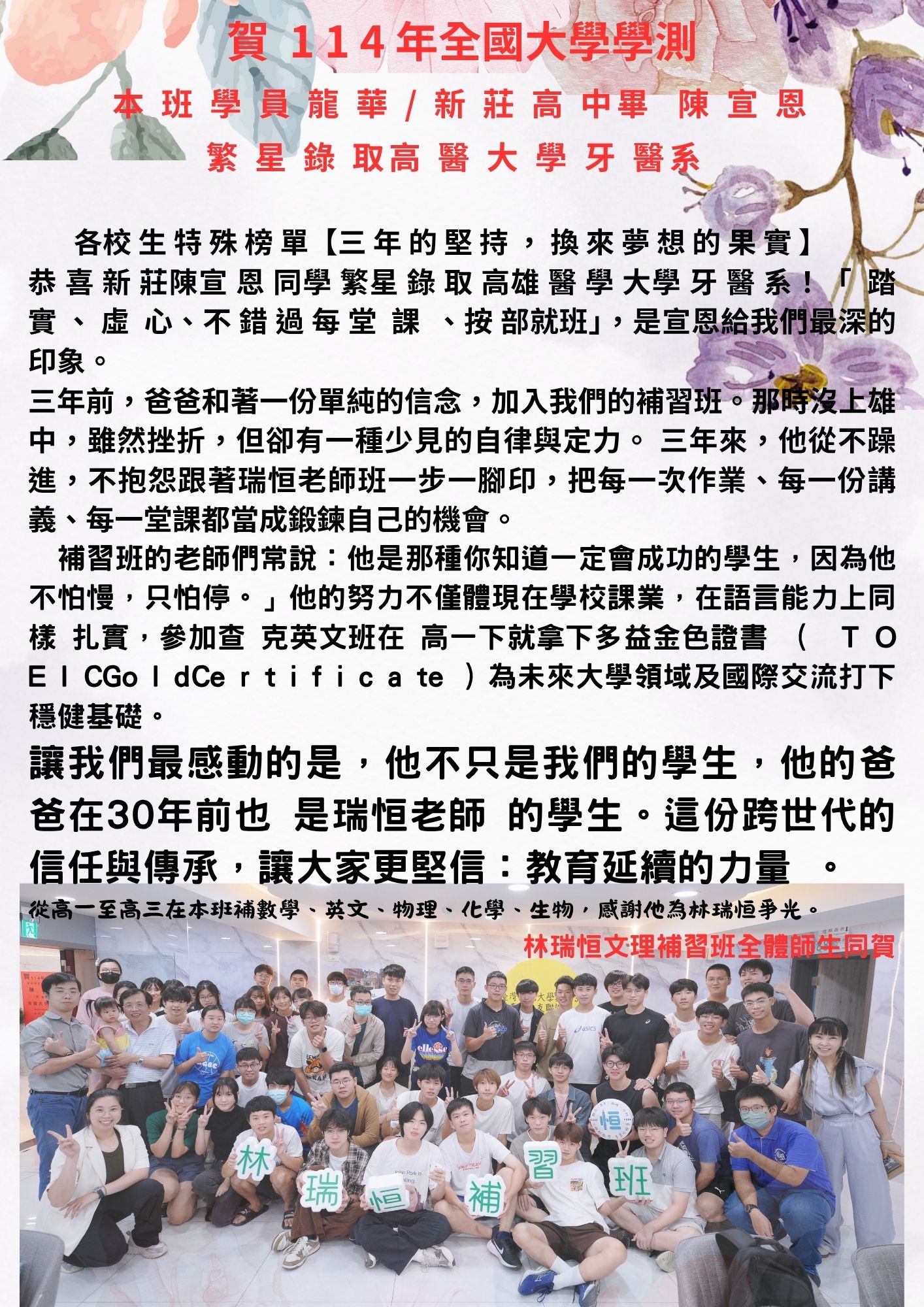 由台師大數學系畢業的林瑞恆老師與子揚老師父子共同教學,擁有多年升學輔導經驗。補習班秉持「觀念為本、思考為先、方法有效」的教學理念,專注培養學生的數理邏輯與應試實力,致力打造升高中全科最強教學陣容。
