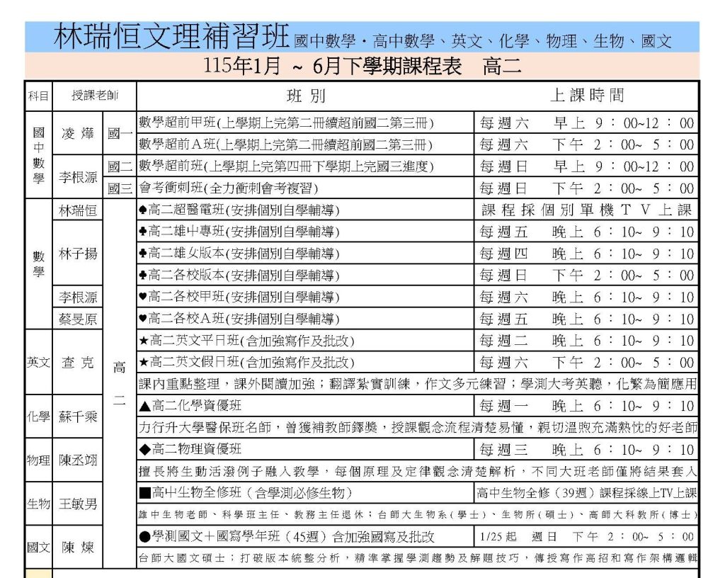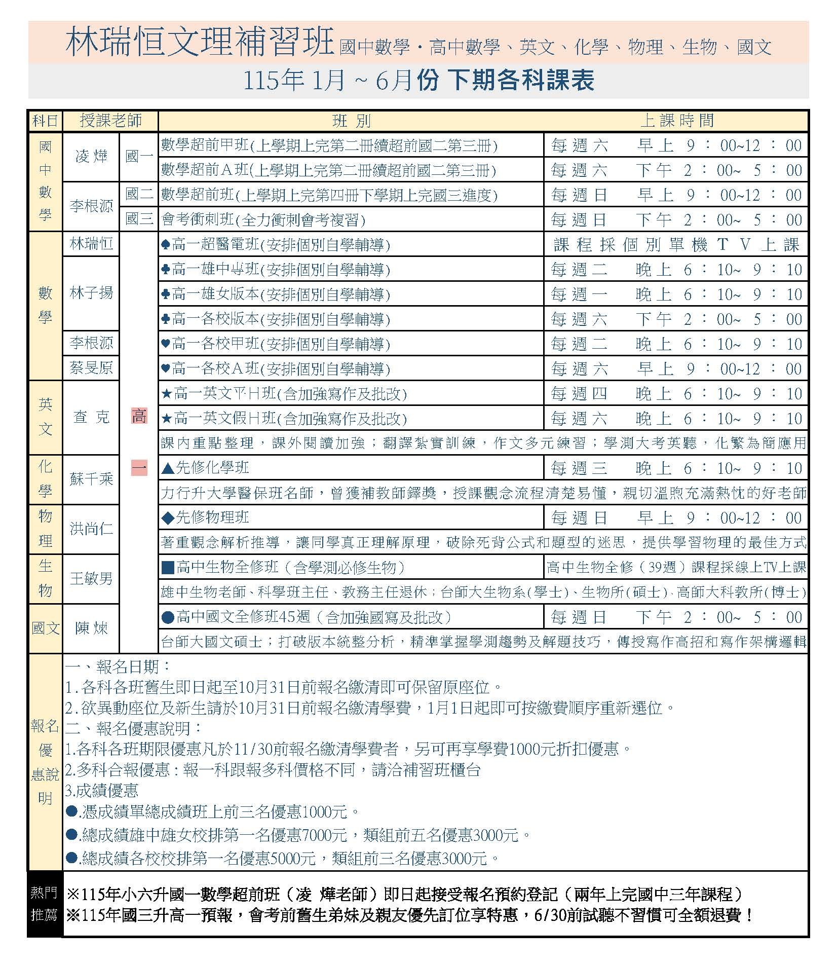 - 雄中專班 每週(二)晚上6:10~9:10班